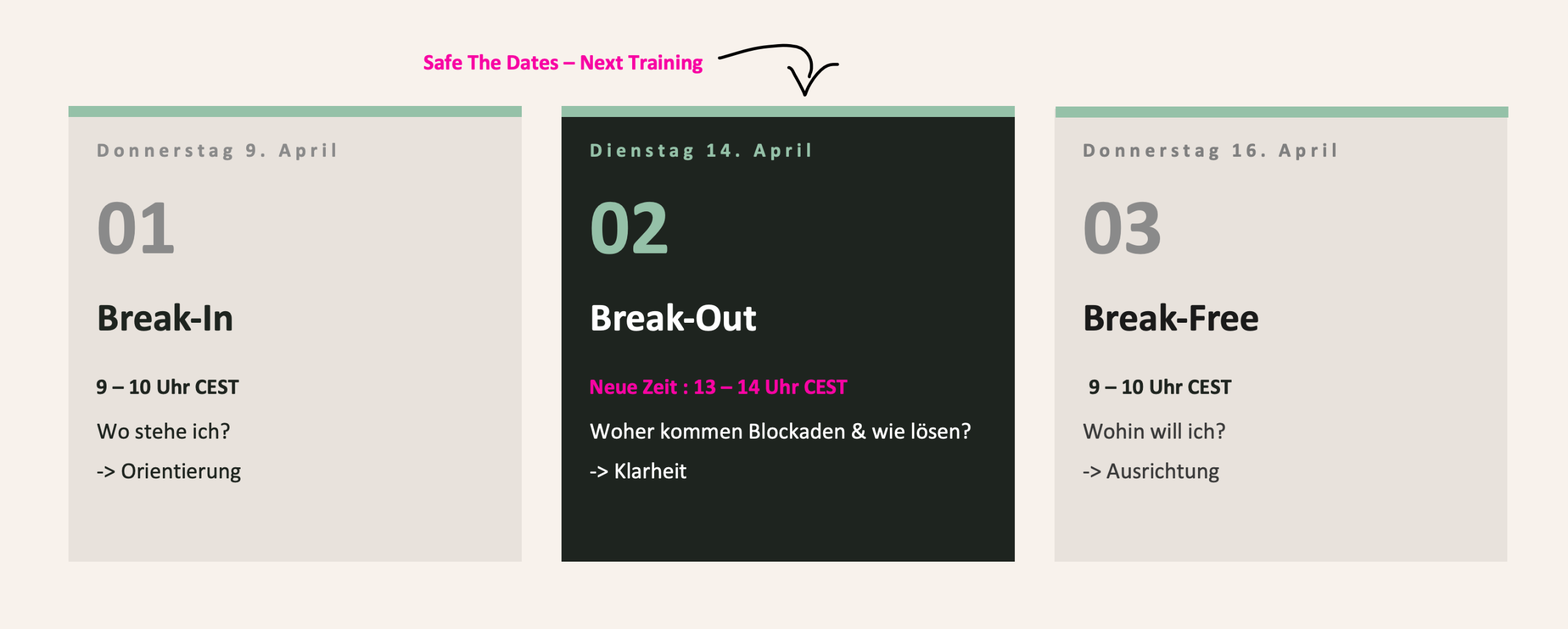 Hier kannst du alle 3 Training Sessions nachträglich anschauen, solltest du eine verpasst haben. Die Sessions bauen aufeinander auf und bleiben verfügbar bis 23. April 23:59 Uhr CEST